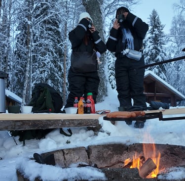 Warm up by the open fire, enjoy hot berry juice or glögi, grill sausages, and take a break whenever needed.